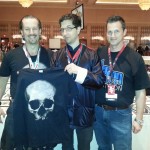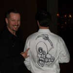 So Eddie Mize, DefCon’s anointed artist was born, for a donation he would sharpie-draw anything you wanted on your laptop, badge, t-shirts – to support the cause. After that event he was asked to start his own booth, so that next year Mize’s art booth has become a yearly tradition, having only missed DefCon 19. He estimates he has drawn on thousands of shirts, not all of them t-shirts either. If you come down and you want your jacket drawn on, that charity golf shirt, want a tattoo design, a tie or the business shirt it comes with, Mize will sketch for the cause. As a security professional that is actively working at the convention, Mize does miss out on the presentations, but he gets a lot of one-on-one time with the people behind the presentations when they come by his booth anyway, so he gets to ask away. Case in point, a recently released documentary about DefCon hit YouTube earlier this month, and you can see Mize throughout, especially at one point where he presents Dark Tangent with a shirt.
