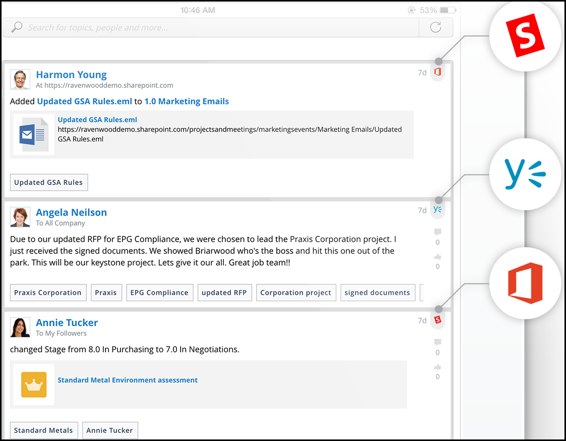 Collage packs a built-in search bar that takes most of the hassle out of looking for such information, making it possible to filter the feed by person, topic or task and leveraging a tagging system that accommodates both structured and unstructured data. Once employees find the notification they’re looking for, they can fire up the application they require to respond directly from the native interface, which takes an additional few seconds out of the process. Added up, that can make for a smoother experience.