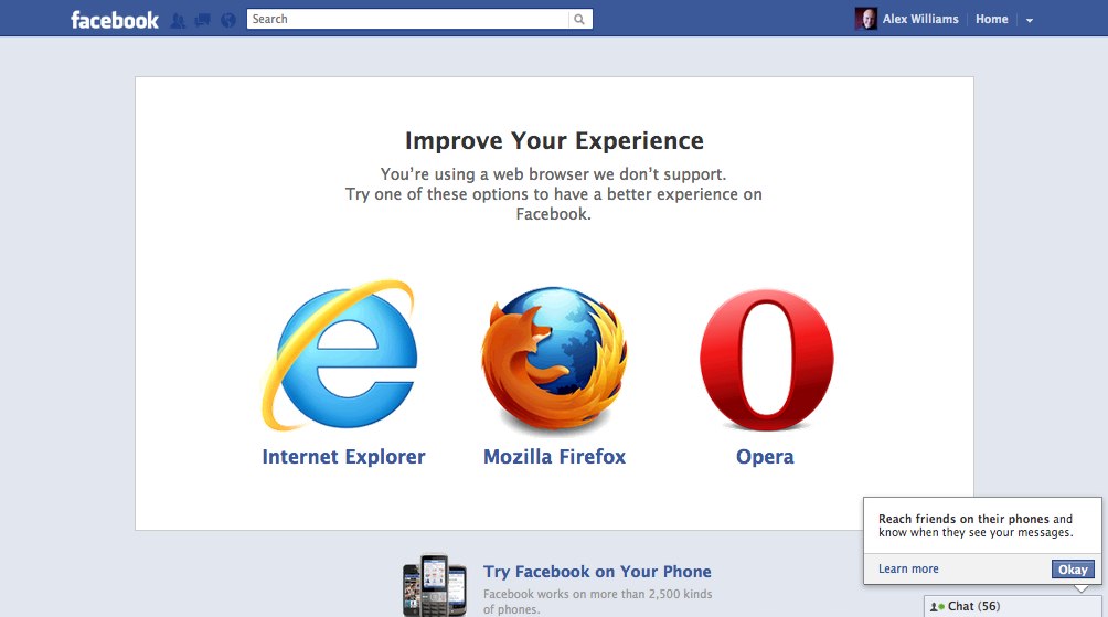 Facebook to Chrome and Safari Users: “You Are Using a Browser We Do Not Support”