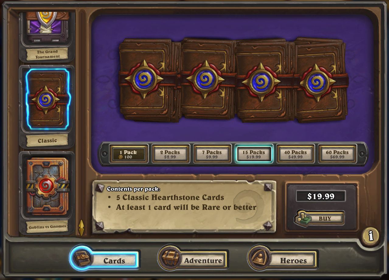 Unless you have enough disposable income to drop $1000 on Hearthstone card packs, you probably want to spend your in-game gold or real-life money as efficiently as possible to get the most (and best) cards for the lowest cost. Here are a few tips on how to get the biggest bang for your buck in Hearthstone. Adventures ...