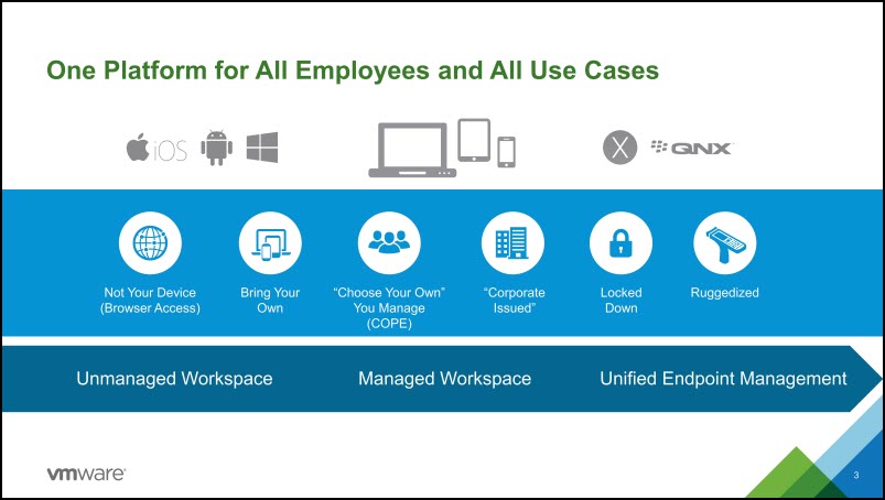 VMware Inc. used its European user conference to introduce a low-end version of its Workspace ONE enterprise mobility management platform and added enhanced security for Microsoft Office 365 applications, along with support for Skype for Business for users of its Horizon virtual desktop infrastructure. VMware Workspace ONE Essentials is an entry-level workspace manager for use ...